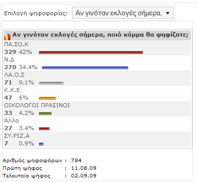 Στις 11 Αυγούστου ξεκίνησε το γκάλοπ του kalabakacity.gr σχετικά με τις εκλογές και την ερώτηση "αν γινόταν εκλογές σήμερα, ποιο κόμμα θα ψηφίζατε;". Σήμερα που δημοσιεύουμε τα αποτελέσματα ανακοινώθηκε και η μέρα διεξαγωγής των εκλογών που όπως έχουμε αναφέρει είναι η 4η Οκτωβρίου. Η "ψήφος" σας στο δικό μας γκάλοπ έβγαλε νικητή το ΠΑΣΟΚ με ποσοστό 42% έναντι της Ν.Δ με 34,4%. Ακολουθεί ο ΛΑ.Ο.Σ με 9.1% και τα υπόλοιπα κόμματα με μικρότερα ποσοστά. Στο γκάλοπ που ξεκίνησε στις 11 Αυγούστου και διήρκεσε μέχρι Τετάρτη 2 Σεπτεμβρίου έλαβαν μέρος 784 επισκέπτες. Βέβαια σε καμιά περίπτωση το αποτέλεσμα που ανακοινώνουμε δεν προκαταβάλει το αποτέλεσμα των εκλογών. Πάντως και το δικό μας γκάλοπ πλησίασε κατά πολύ όσα έχουν δημοσιευτεί κατά καιρούς με την ψαλίδα να ανοίγει κατά πολύ ανάμεσα στα δυο κόμματα. Το τελικό αποτέλεσμα και ο νικητής στις 4 Οκτωβρίου το βράδυ…
