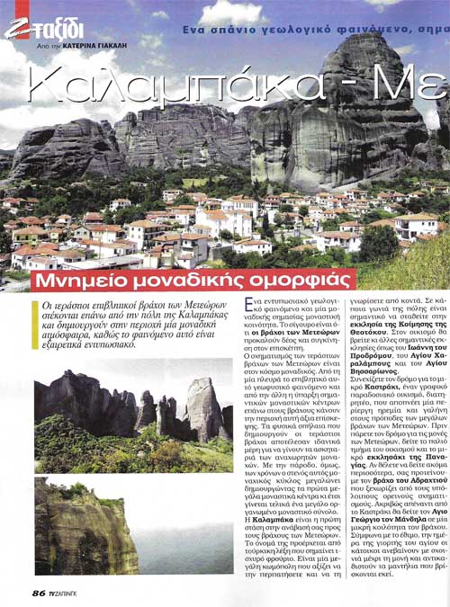 "Οι τεράστιοι επιβλητικοί βράχοι των Μετεώρων στέκονται επάνω από την πόλη της Καλαμπάκας και δημιουργούν στην περιοχή μια μοναδική ατμόσφαιρα, καθώς το φαινόμενο αυτό είναι εξαιρετικά εντυπωσιακό". Κάπως έτσι ξεκινά το μικρό αφιέρωμα στην πόλη μας και τα Μετέωρα, δίνοντας κάποιες χρήσιμες πληροφορίες σε όσους θέλουν να έρθουν κοντά μας τις μέρες των Χριστουγέννων. Και η αναφορά στην Καλαμπάκα συνεχίζει και αναφέρει σε κάποιο σημείο " ….δοκιμάστε γλυκό σπάτουλα από το ζαχαροπλαστείο Κυβέλεια, γλυκά του κουταλιού του γυναικείου συνεταιρισμού Ασπροκκλησιάς και Χαλβά από τον Ρόμπο στην Καλαμπάκα". Όλα αυτά και πολλά άλλα χρήσιμα πράγματα στο τεύχος 822 του TVΖΑΠΙΝΓΚ.