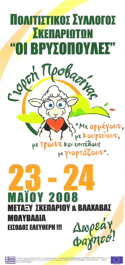 Για δεύτερη χρονιά θα πραγματοποιηθεί φέτος η γιορτή της προβατίνας στο Σκεπάρι του Δήμου Χασίων από τον Πολιτιστικό Σύλλογο Σκεπαριωτών "Οι Βρυσοπούλες". Η πρόεδρος του Συλλόγου κ. Σουζάνα Πασχάλη έχει βάλει τα δυνατά της και οι εκδηλώσεις αρχίζουν φέτος από την Παρασκευή 23 Μαΐου στις 20.00 το βράδυ στην περιοχή "Μολυβαδιά" που βρίσκεται μεταξύ Σκεπαρίου και Βλαχάβας. Περισσότερα όμως και τι περιλαμβάνουν οι εκδηλώσεις δείτε το πρόγραμμα που ακολουθεί.