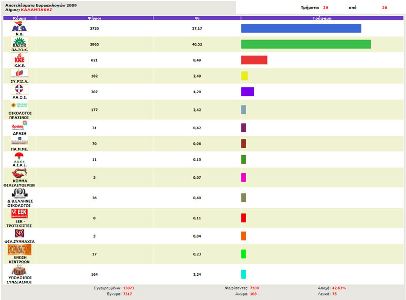 Τελικός πίνακας ψήφων ανά κόμμα στην Καλαμπάκα
