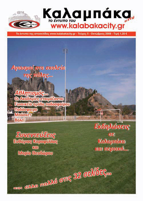 Κυκλοφόρησε την Πέμπτη το μεσημέρι το τεύχος Νο 5 "Καλαμπάκα City" της ιστοσελίδας μας. Είναι μια προσπάθεια που την ξεκινήσαμε πριν λίγο καιρό και συνεχίζεται χάρη στην δική σας στήριξη. Σ’ αυτό το περιοδικό θα βρείτε ότι έχει συμβεί από πλευράς εκδηλώσεων σε Καλαμπάκα και την περιοχή της, την έντονη αθλητική κίνηση ξεκινώντας από ποδόσφαιρο εως Βόλεϊ και άλλα πολλά θέματα.