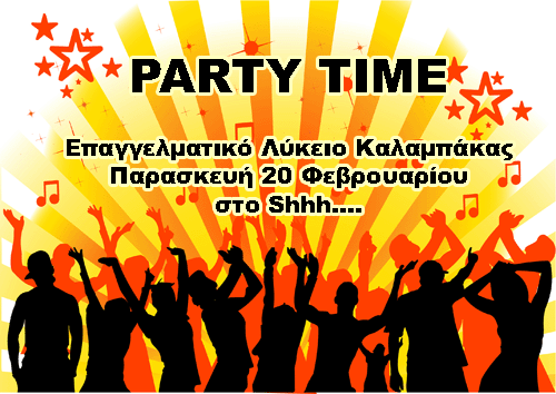 Το Επαγγελματικό Λύκειο Καλαμπάκας σας προσκαλεί στο πάρτι που διοργανώνει την Παρασκευή 20 Φεβρουαρίου στο cafe/bar Shhh….