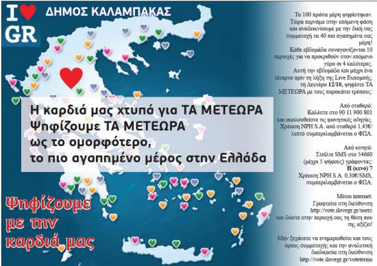 Ψηφίστε για τα ΜετέωραΟ τηλεοπτικός σταθμός ΣΚΑΪ, στο πλαίσιο της καινούργιας του εκπομπής «I LOVE GR» θα δείξει τον πιο αγαπημένο προορισμό των Ελλήνων. Ύστερα από ψηφοφορία που πραγματοποιήθηκε μέχρι το τέλος Ιουλίου καταγράφηκαν οι 100 πιο αγαπημένες περιοχές και τουριστικοί προορισμοί της χώρας μας, ανάμεσα στις οποίες είναι και τα Μετέωρα.