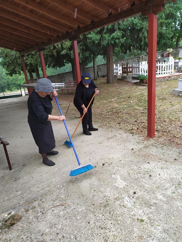Ο Ιερέας του χωριού π. Δημήτριος Ράγκος έπιασε το χορτοκοπτικό – μισινέζα και μαζί με εθελοντές, κατοίκους του Αγιοφύλλου, έκοψαν τα χόρτα και καθάρισαν το κοιμητήριο, κάνοντάς το αγνώριστο.