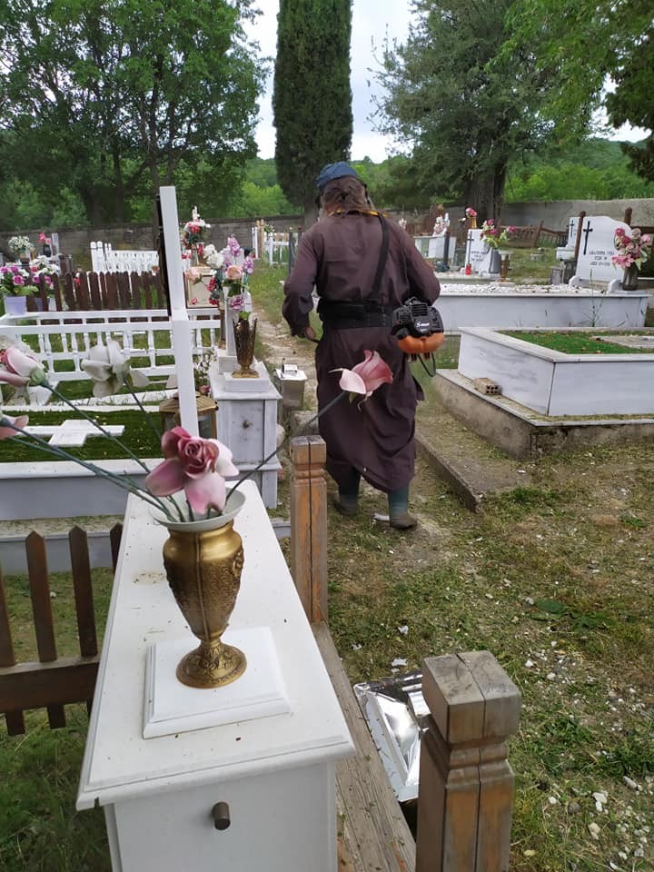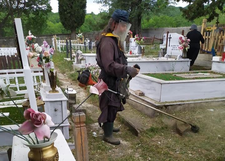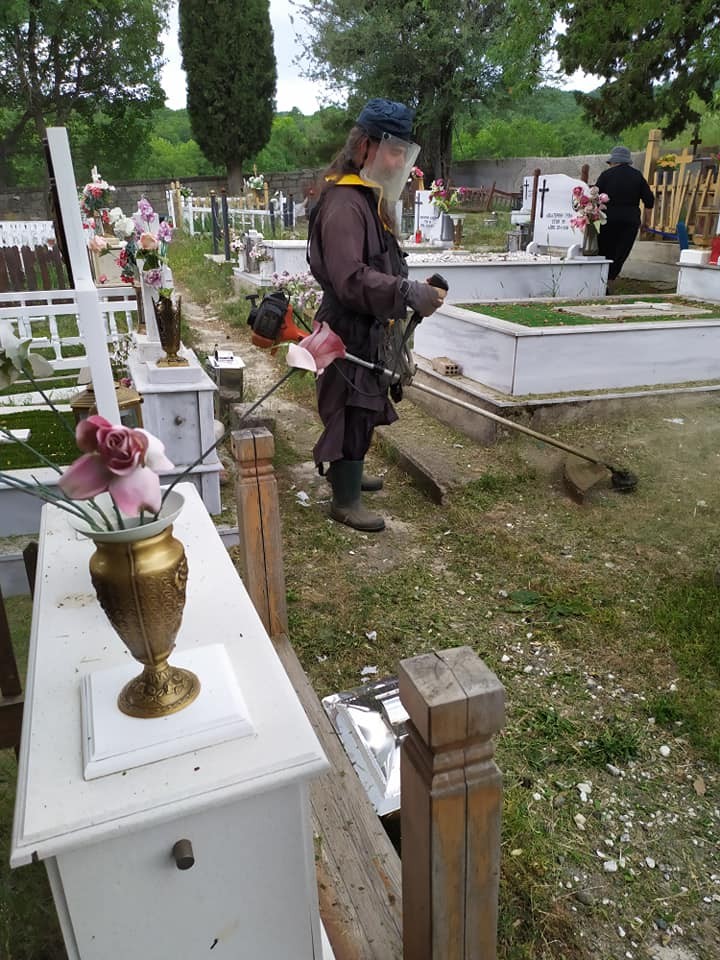 Ο Ιερέας του χωριού π. Δημήτριος Ράγκος έπιασε το χορτοκοπτικό – μισινέζα και μαζί με εθελοντές, κατοίκους του Αγιοφύλλου, έκοψαν τα χόρτα και καθάρισαν το κοιμητήριο, κάνοντάς το αγνώριστο.