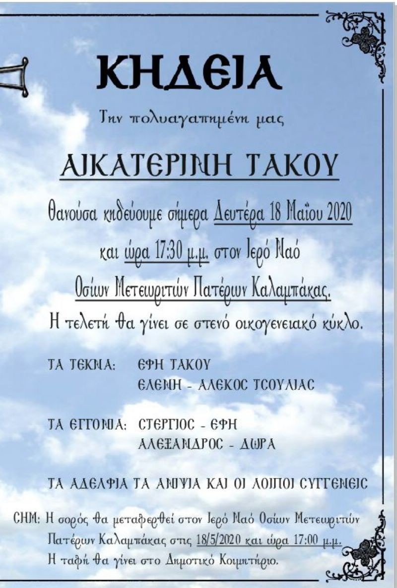 Η κηδεία της θα γίνει σήμερα Δευτέρα και ώρα 17:30 το απόγευμα από τον Ιερό Ναό Οσίων Μετεωριτών Πατέρων Καλαμπάκας.