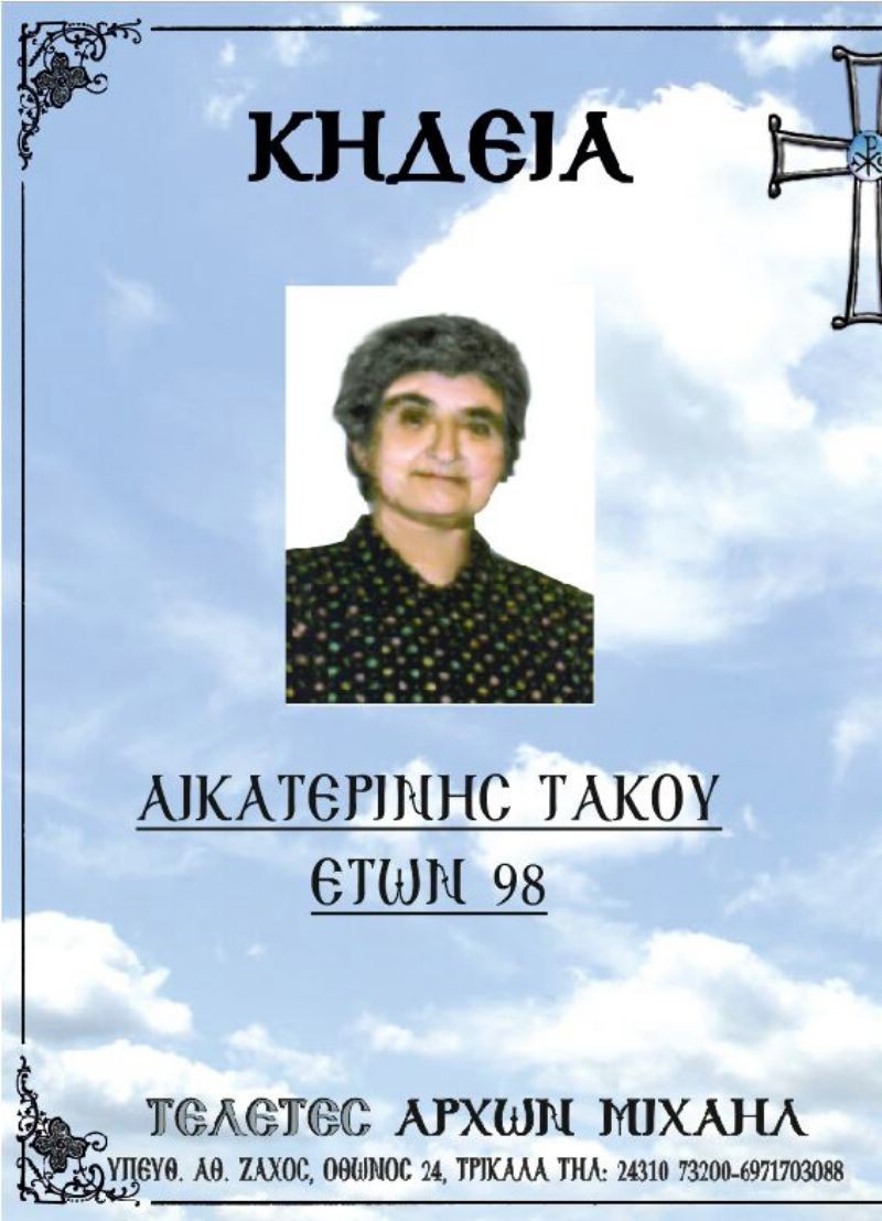 Την κηδεία επιμελείται το Γραφείο “Τελετές ΑΡΧΩΝ ΜΙΧΑΗΛ”, Όθωνος 24 Τρίκαλα