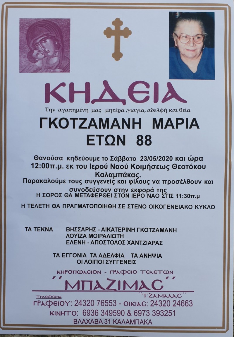 Η κηδεία της θα γίνει το Σάββατο 23 Μαΐου στις 12:00 μ.μ. από τον Ιερό Ναό Κοιμήσεως της Θεοτόκου Καλαμπάκας.