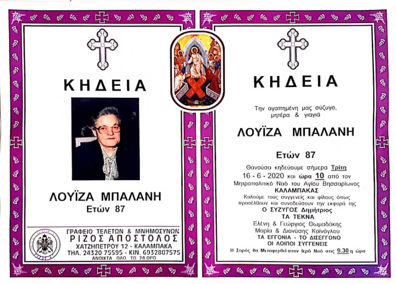 Την πολυαγαπημένη μας σύζυγο, μητέρα και γιαγιά ΛΟΥΪΖΑ ΜΠΑΛΑΝΗ ετών 87 θανούσα κηδεύουμε την Τρίτη 16 – 6 – 2020 και ώρα 10:00 π.μ στον Μητροπολιτικό Ιερό Ναό Αγίου Βησσαρίωνος Καλαμπάκας.