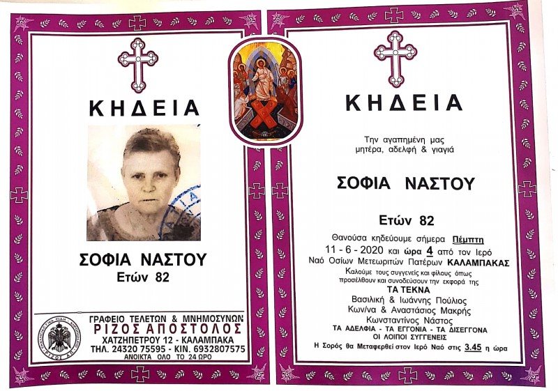 Την πολυαγαπημένη μας μητέρα , αδελφή και γιαγιά Σοφία Νάστου ετών 82 θανούσα κηδεύουμε σήμερα Πέμπτη 11 – 6 – 2020 και ώρα 4:00 το μεσημέρι στον Ιερό Ναό Οσίων Μετεωριτών πατέρων Καλαμπάκας.