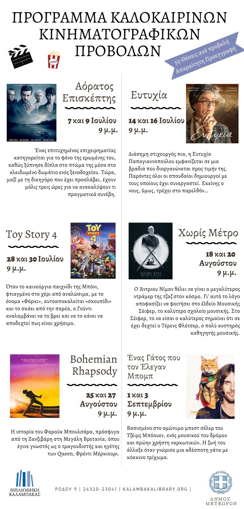 Ο Δήμος Μετεώρων σε συνεργασία με την Βιβλιοθήκη Καλαμπάκας διοργανώνουν και φέτος το καλοκαίρι κινηματογραφικές προβολές στην πίσω αυλή της Βιβλιοθήκης.