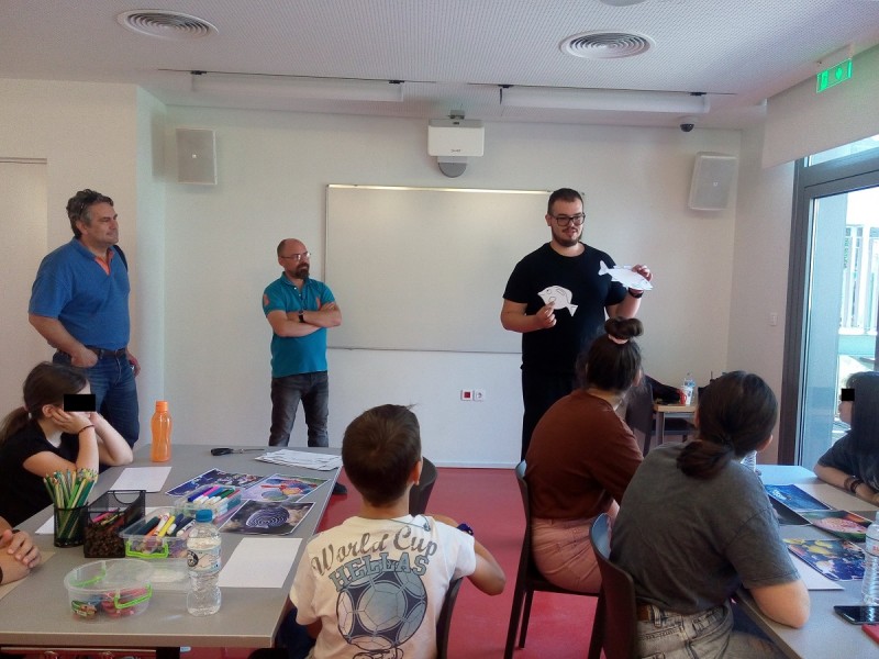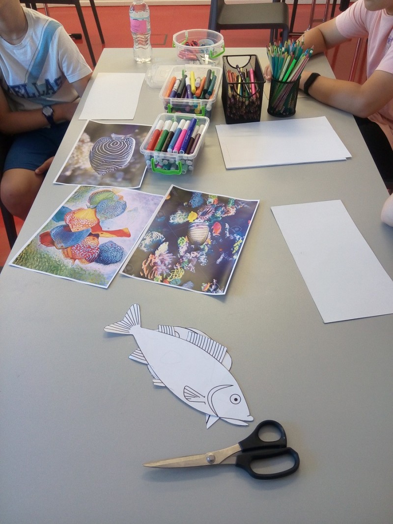 Το εργαστήριο ξεκίνησε με το σχεδιασμό και τη μορφοποίηση ενός αντικειμένου, συγκεκριμένα ενός ψαριού, με ελεύθερο χέρι . Τα παιδιά έμαθαν για τη τεχνική του σχεδίου και στη συνέχεια, με τη καθοδήγηση του εκπαιδευτή, αξιοποίησαν τις ιδέες τους, συνδύασαν σχέδια και χρώματα και αποτύπωσαν στο χαρτί τη μορφή που εμπνεύστηκαν.