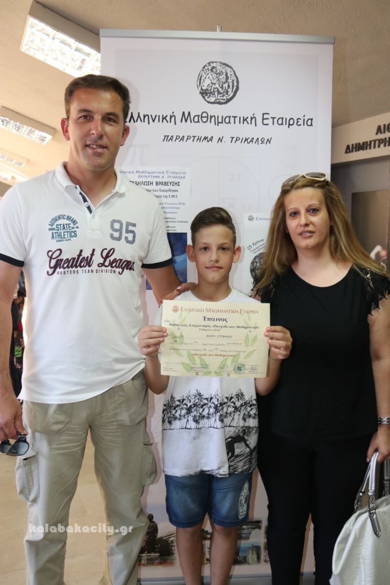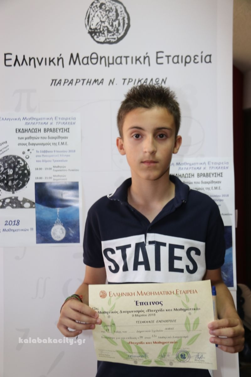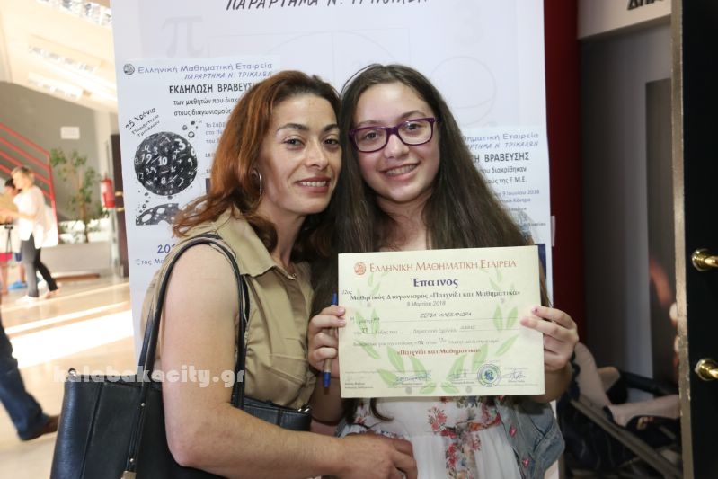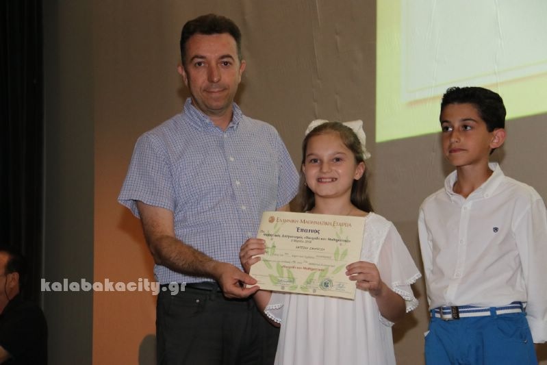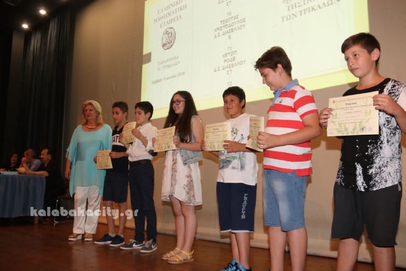 Σε ειδική εκδήλωση που έγινε σήμερα στα Τρίκαλα βραβεύτηκαν οι μαθητές των Δημοτικών, Γυμνασίων και Λυκείων που διακρίθηκαν στους μαθηματικούς διαγωνισμούς της Ελληνικής Μαθηματικής Εταιρίας κατά το σχολικό έτος 2017 -2018..