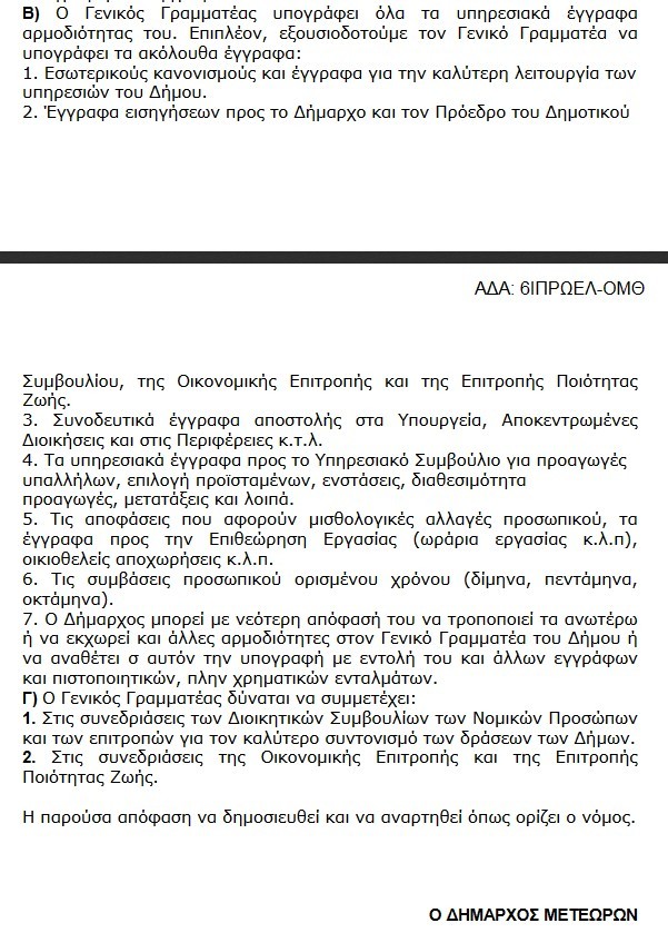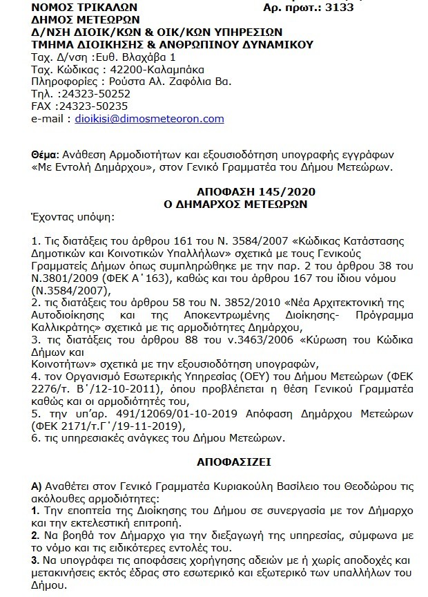 Δήμος Μετεώρων: Οι Αρμοδιότητες του Γενικού Γραμματέα