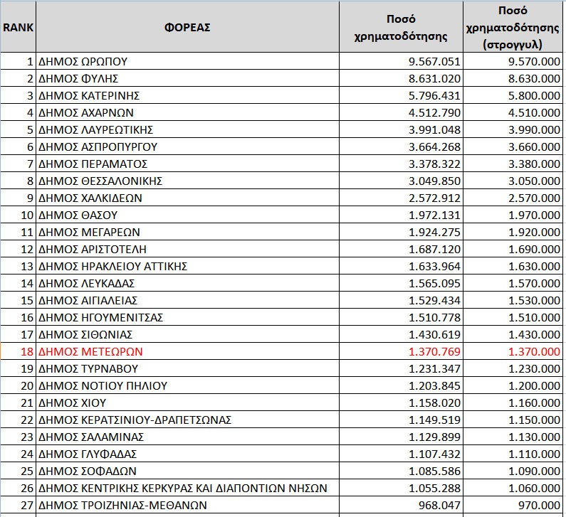 Στον Δήμο Μετεώρων το καθαρό ποσό χρηματοδότησης ανέρχεται σε 1.370.000 εκ. ευρώ