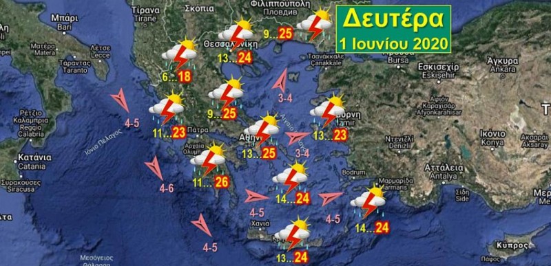 Δευτέρα, 1-6-2020 Άστατος καιρός με συννεφιά, τοπικές βροχές και σποραδικές καταιγίδες από τις πρωινές ώρες στην κεντρική-ανατολική Μακεδονία, τη Θράκη και την περιοχή του Αιγαίου και από το μεσημέρι και το απόγευμα και στις υπόλοιπες περιοχές.