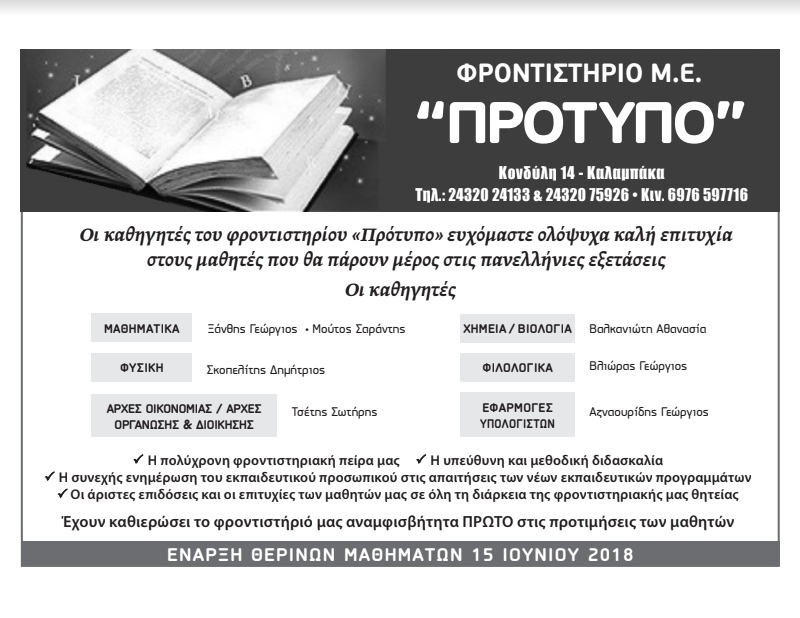 Οι καθηγητές του φροντιστηρίου «Πρότυπο» ευχόμαστε ολόψυχα καλή επιτυχία στους μαθητές που θα πάρουν μέρος στις πανελλήνιες εξετάσεις.