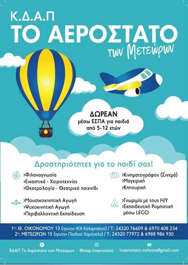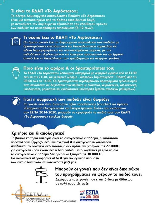 Θα θέλαμε να σας ενημερώσουμε ότι: το ιδιωτικό ΚΔΑΠ ” Το Αερόστατο των Μετεώρων ” συμμετέχει στη δράση “Εναρμόνιση Οικογενειακής και Επαγγελματικής Ζωής” το οποίο εντάσσεται στο ΕΣΠΑ.