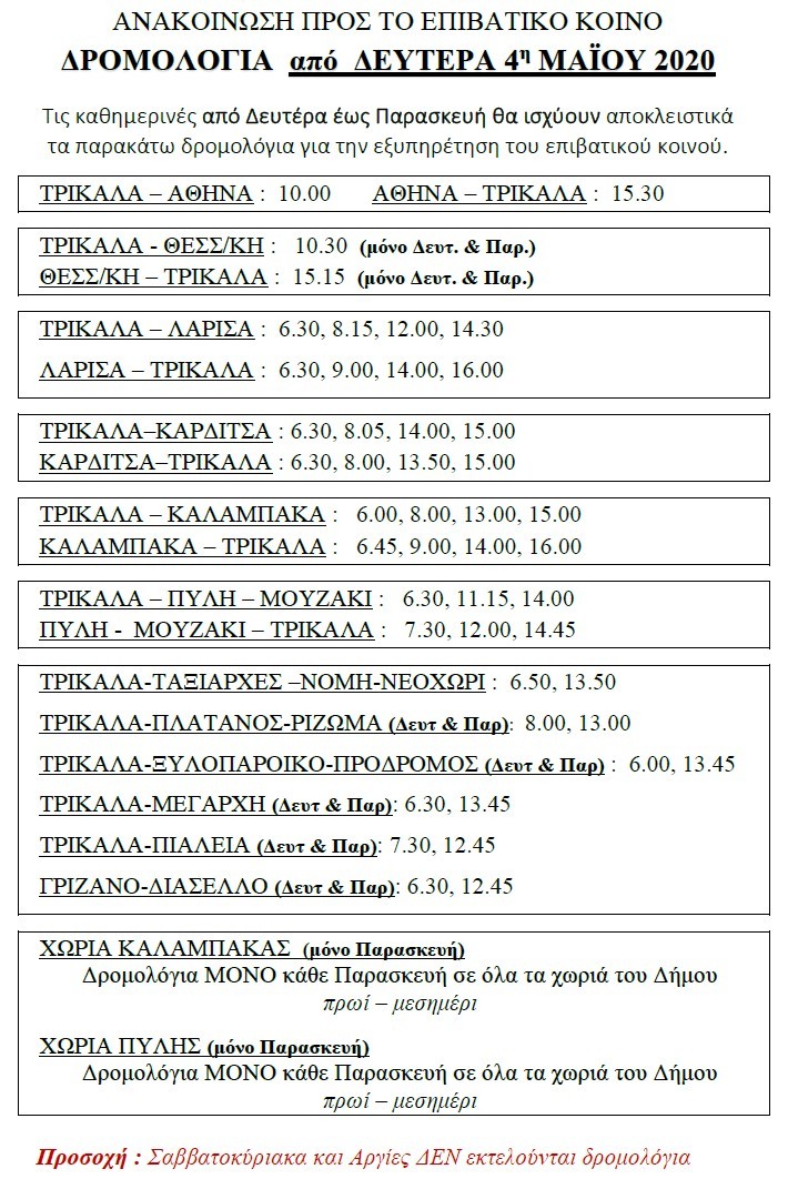 Τα δρομολόγια του ΚΤΕΛ Τρικάλων από τη Δευτέρα 4 Μαϊού έχουν ως εξής, όπως ανακοινώθηκαν από την Διοίκηση:
