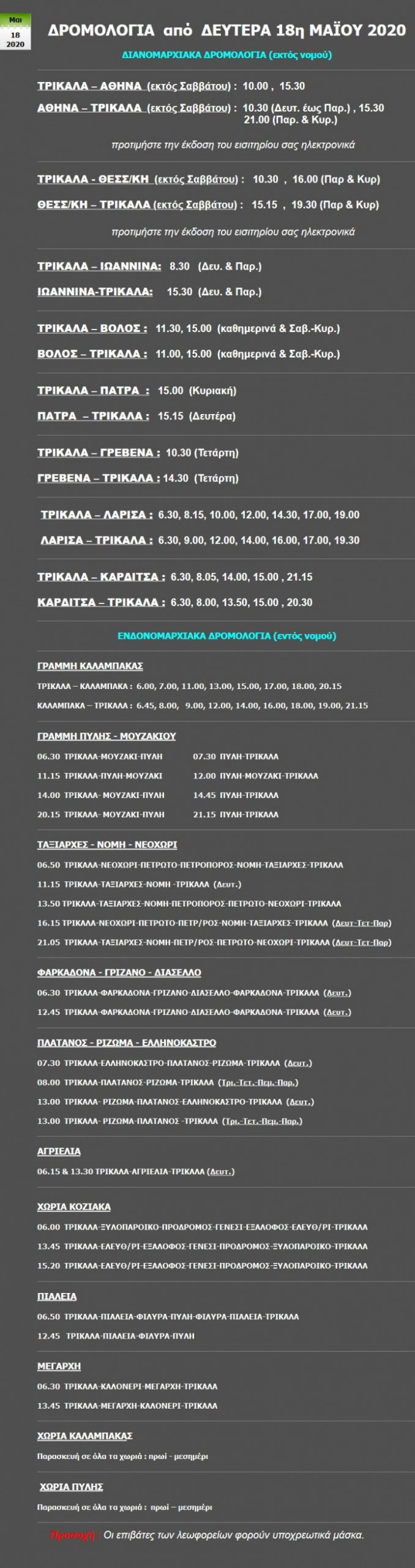 Τα δρομολόγια του ΚΤΕΛ Τρικάλων από τη Δευτέρα 18 Μαΐου έχουν ως εξής, όπως ανακοινώθηκαν από την Διοίκηση: