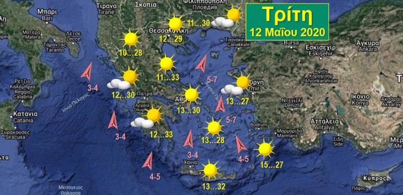 Σήμερα Τρίτη, 12-5-2020 καλός και ζεστός καιρός, αίθριος σ’ όλη τη χώρα. Περιορισμένη ορατότητα αναμένεται τη νύχτα και το πρωί, καθώς και μεταφορά Αφρικανικής σκόνης. Η θερμοκρασία σε άνοδο, με μέγιστες τιμές στα ηπειρωτικά στους 32-33 βαθμούς.