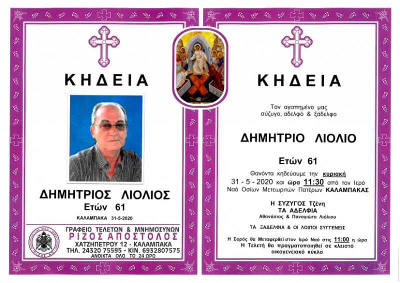 Τον πολυαγαπημένο μας σύζυγο, αδελφό και ξάδελφο Δημήτριο Λιόλιο ΕΤΩΝ 61 Θανόντα κηδεύουμε την Κυριακή 31-5-2020 και ώρα 11:30 το πρωί στον Ιερό Ναό Οσίων Μετεωριτών πατέρων Καλαμπάκας.