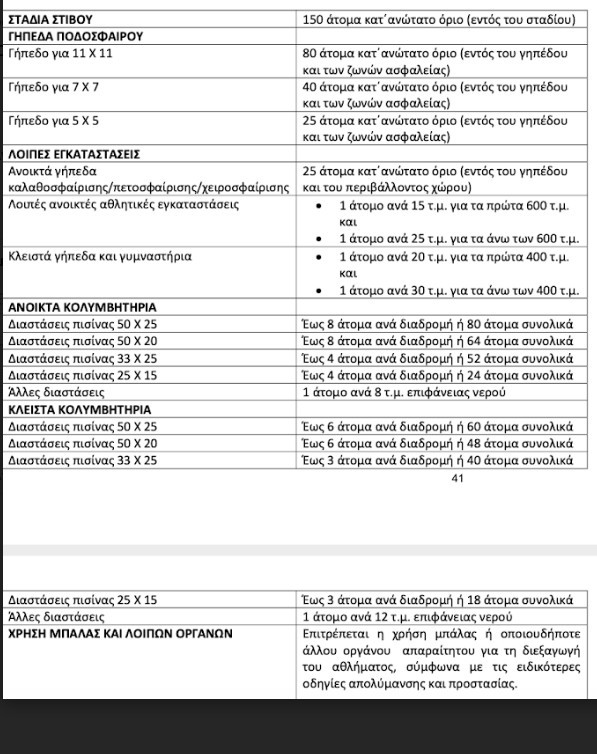 Σύμφωνα με τα υπάρχοντα επιστημονικά δεδομένα και στο πλαίσιο της άσκησης με επαρκή απόσταση ασφαλείας, δίνεται παρακάτω ο μέγιστος αριθμός αθλουμένων, ανά εγκατάσταση, ο οποίος θα επικαιροποιείται με νεότερες οδηγίες και με βάση τα νέα επιστημονικά στοιχεία και την πορεία της πανδημίας.