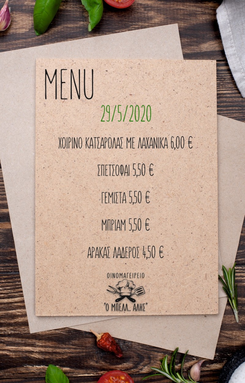 Το Οινομαγειρείο ” Ο ΜΠΕΛΛ..ΑΛΗΣ” στην Καλαμπάκα που βρίσκεται στην οδό Ράμμου 16 προτείνει για σήμερα Παρασκευή 29 Μαΐου, τα εξής μαγειρευτά φαγητά τα οποία έρχονται στο σπίτι σας – delivery – με ένα τηλεφώνημα στο τηλ.: 24320 77909.