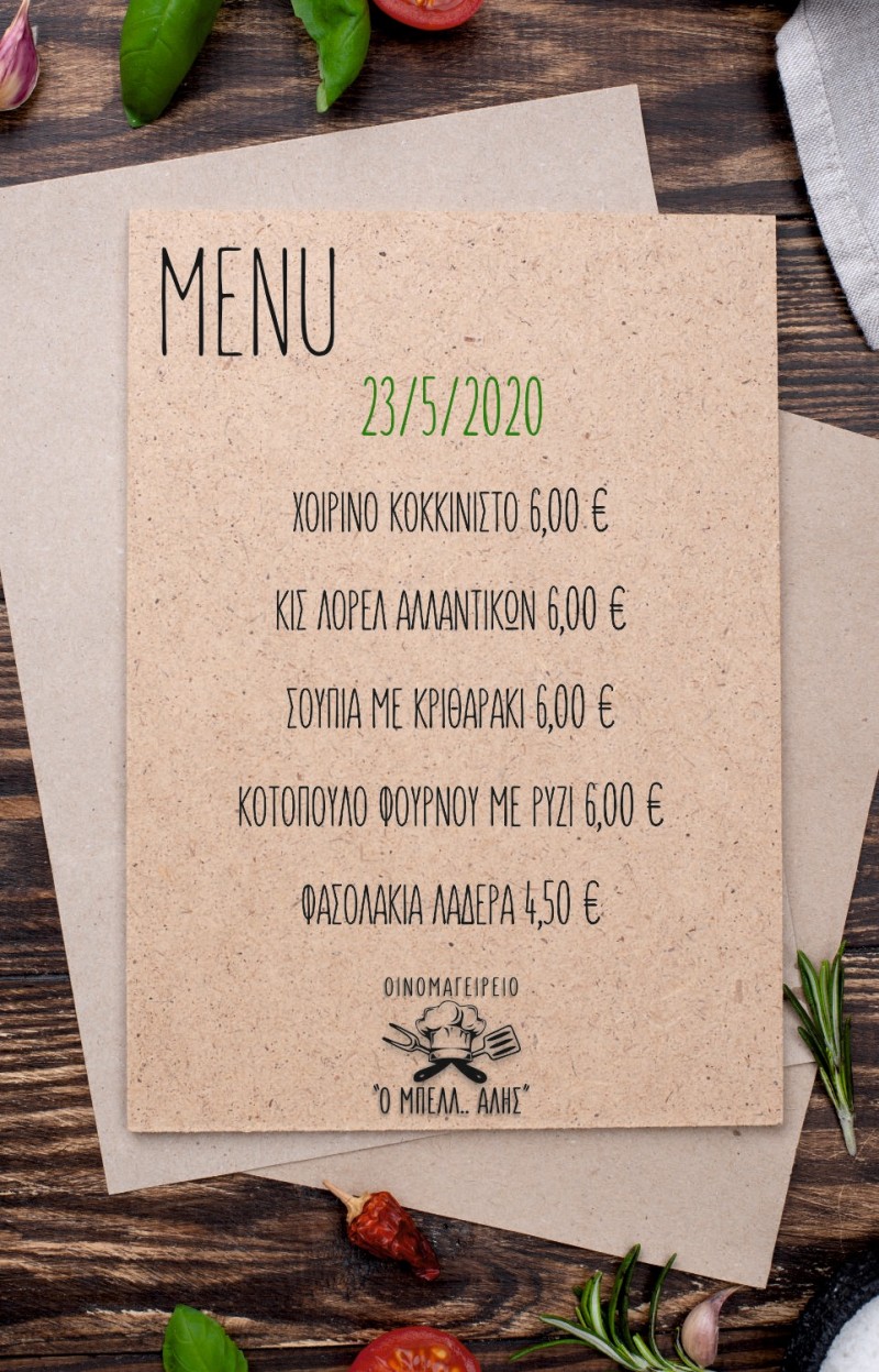 Το Οινομαγειρείο ” Ο ΜΠΕΛΛ..ΑΛΗΣ” στην Καλαμπάκα που βρίσκεται στην οδό Ράμμου 16 προτείνει για σήμερα Σάββατο 23 Μαΐου, τα εξής μαγειρευτά φαγητά τα οποία έρχονται στο σπίτι σας – delivery – με ένα τηλεφώνημα στο τηλ.: 24320 77909.
