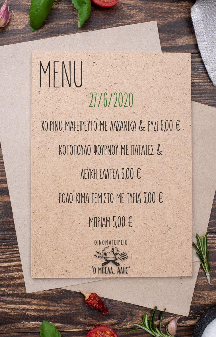 Το Οινομαγειρείο ” Ο ΜΠΕΛΛ..ΑΛΗΣ” στην Καλαμπάκα που βρίσκεται στην οδό Ράμμου 16 προτείνει για σήμερα Σάββατο 27 Ιουνίου, τα εξής μαγειρευτά φαγητά τα οποία έρχονται στο σπίτι σας – delivery – με ένα τηλεφώνημα στο τηλ.: 24320 77909.