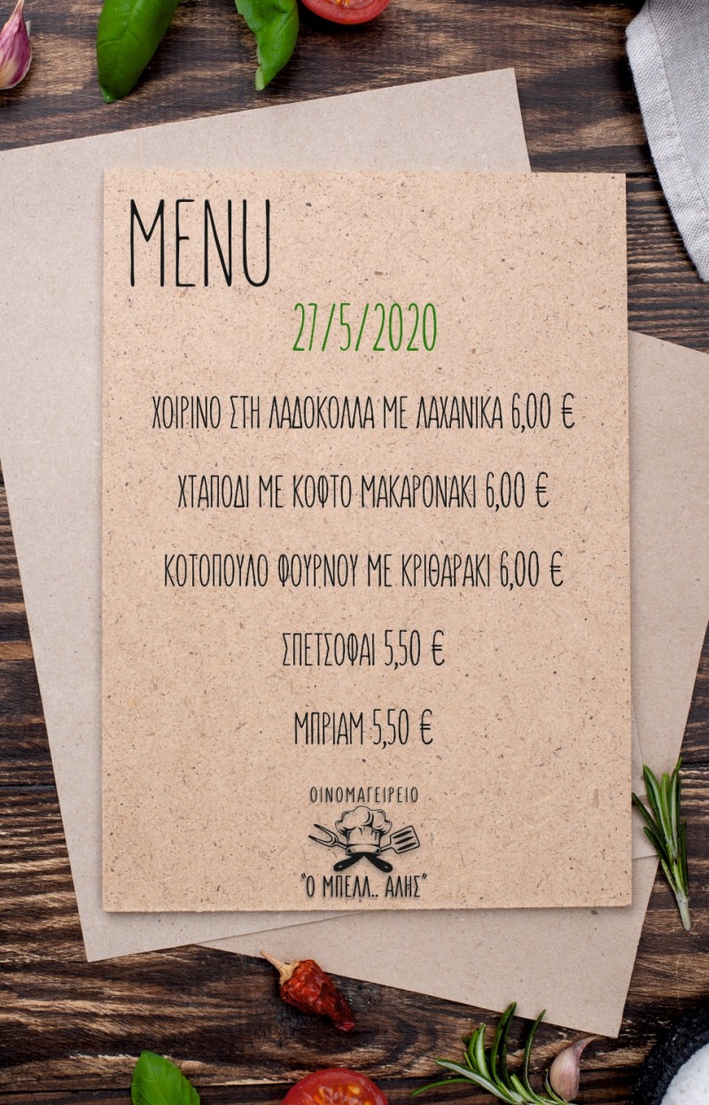 Το Οινομαγειρείο ” Ο ΜΠΕΛΛ..ΑΛΗΣ” στην Καλαμπάκα που βρίσκεται στην οδό Ράμμου 16 προτείνει για σήμερα Τετάρτη 27 Μαΐου, τα εξής μαγειρευτά φαγητά τα οποία έρχονται στο σπίτι σας – delivery – με ένα τηλεφώνημα στο τηλ.: 24320 77909.