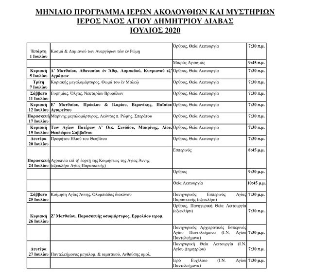 Το πρόγραμμα των Ιερών Ακολουθιών και Μυστηρίων για τον Ιούλιο στον Ι.Ν. Αγίου Δημητρίου Διάβας έχει ως εξής: