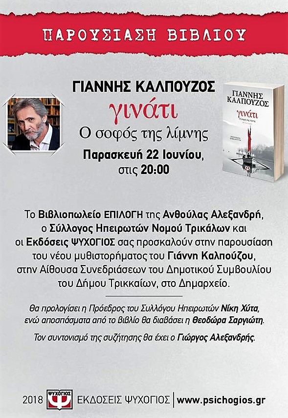Παρουσίαση βιβλίου του Γιάννη Καλπούζου «γινάτι – Ο σοφός της λίμνης», από το Σύλλογο Ηπειρωτών Ν. Τρικάλων, τις εκδόσεις ΨΥΧΟΓΙΟΣ και το βιβλιοπωλείο ΕΠΙΛΟΓΗ της Ανθούλας Αλεξανδρή, θα πραγματοποιηθεί την Παρασκευή 22 Ιουνίου 2018 και ώρα 20.00, στην αίθουσα συνεδριάσεων του Δημοτικού Συμβουλίου του Δήμου Τρικκαίων.