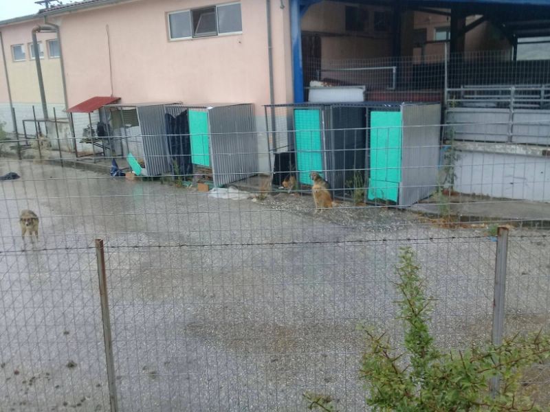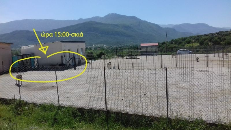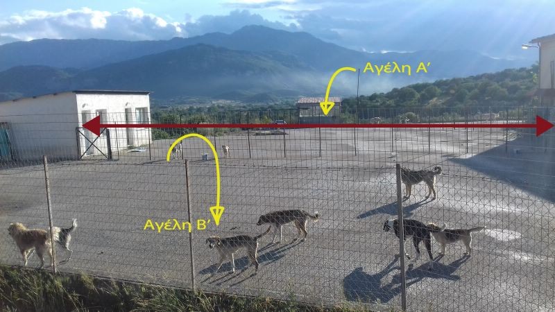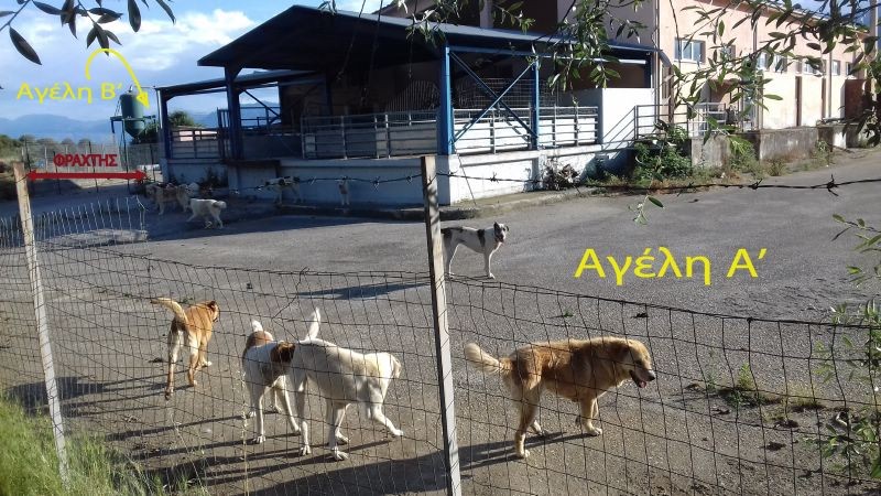 (Φώτο 1). Η Αγέλη Β’ είναι περιορισμένη σε λιγότερα τετραγωνικά στο πίσω μέρος της αυλής όπου υπάρχουν 5 κλουβιά. Τα κλουβιά αυτά είναι διάτρητα από τις δύο πλευρές και ψηλά περίπου 2 μέτρα. Με λίγα λόγια σε περίπτωση απλής βροχής (κι όχι των καταιγίδων που ρίχνει αυτές τις μέρες) τα ζώα είναι μόνιμα μούσκεμα. Επίσης τις μέρες του καύσωνα, όπου η θερμοκρασία στο τσιμέντο φτάνει τους 40 βαθμούς ,ο χώρος έχει σκιά λίγων