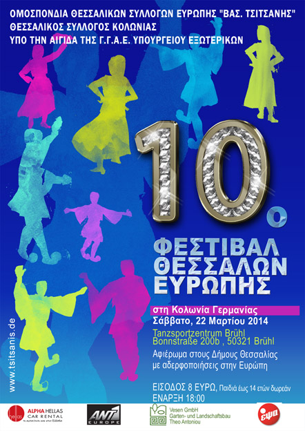 Η Ομοσπονδία Θεσσαλικών Συλλόγων Γερμανίας και άλλων κρατών Ευρώπης «ΒΑΣΙΛΗΣ ΤΣΙΤΣΑΝΗΣ» Α.Σ. και ο Θεσσαλικός Σύλλογος Κολωνίας» με τη συμμετοχή των Συλλόγων-Μελών (Μονάχου, Νυρεμβέργης, Βισμπάντεν, Ελβετία, Ντύσσελντορφ, Σβάινφουρτ, Βερολίνο, Γκύτερσλο και Μπίλεφελντ) και της ομάδας Θεσσαλών Ουγγαρίας, Αυστρίας, Δανίας, Γαλλίας και Ιρλανδίας διοργανώνουν το 10ο Φεστιβάλ Θεσσαλών Ευρώπης στη Κολωνία στις 22 Μαρτίου 2014.