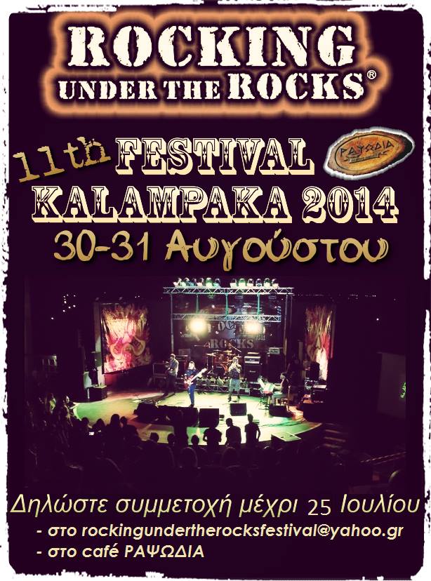 Όπως αναφέραμε σε αρχικό δημοσίευμά μας το 11th Rocking Under The Rocks Festival θα πραγματοποιηθεί το διήμερο 30 και 31 Αυγούστου στο ανοιχτό θέατρο Καλαμπάκας και με ανακοίνωσή της η διοργάνωση του θεσμού καλεί όσα γκρουπ ενδιαφέρονται να συμμετέχουν δηλώσουν συμμετοχή στο [email protected] ή στο cafe Ραψωδία!