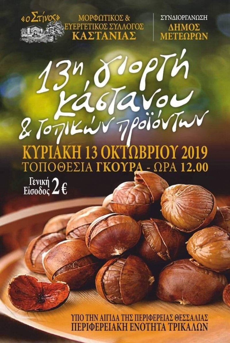 Ο Μορφωτικός & Ευεργετικός Σύλλογος Καστανιάς «Ο ΣΤΙΝΟΣ» υπό την αιγίδα του Δήμου Μετεώρων και της Περιφερειακής Ενότητας Τρικάλων, διοργανώνει την Κυριακή 13 Οκτωβρίου 2019 στη θέση «Γκούρα», στην Καστανιά Καλαμπάκας, την 13η Γιορτή Καστάνου & Τοπικών Προϊόντων.
