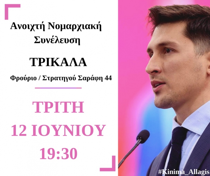 Η Νομαρχιακή Επιτροπή του Κινήματος Αλλαγής Τρικάλων, σας προσκαλεί την Τρίτη 12 Ιουνίου 2018 και ώρα 19:30, στο Φρούριο Τρικάλων (Στρατηγού Σαράφη 44), όπου θα πραγματοποιηθεί πολιτική εκδήλωση με Κεντρικό Ομιλητή τον Εκπρόσωπο Τύπου του Κινήματος Αλλαγής κ. Παύλο Χρηστίδη.