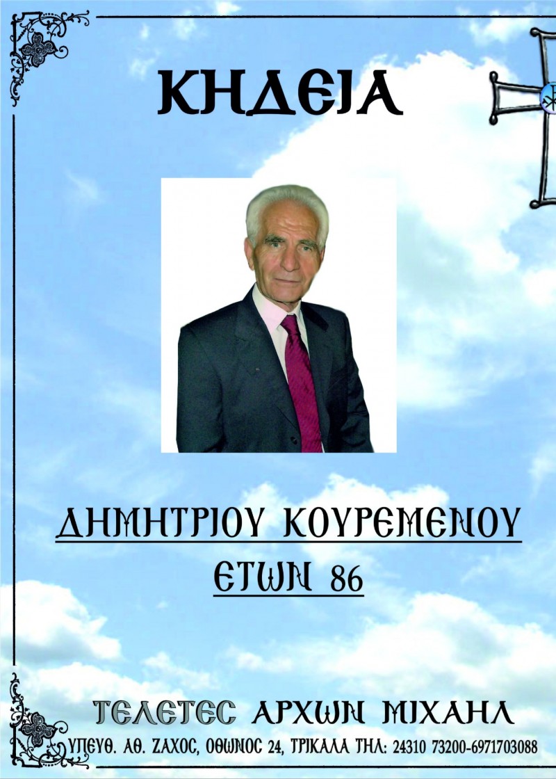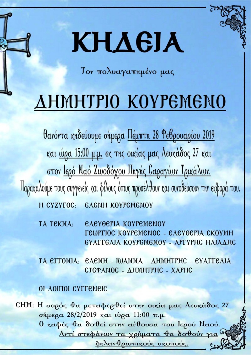 Απεβίωσε ο Δημήτριος Κουρεμένος Ανακοινώσεις Από admin Δημοσίευση Φεβ 28, 2019 -12:00 0 1.318 Κοινοποίηση FacebookTwitterΗλεκτρονικό ΤαχυδρομείοViber Απεβίωσε ο Δημήτριος Κουρεμένος σε ηλικία 86 ετων. Η κηδεία του θα γίνει σήμερα Πέμπτη 28 Φεβρουαρίου στις 15:00 εκ της οικίας μας Λευκάδος 27 και στον Ιερο Ναο Ζωοδόχου Πηγής Σαραγίων Τρικάλων. 0 1.318 Κοινοποίηση