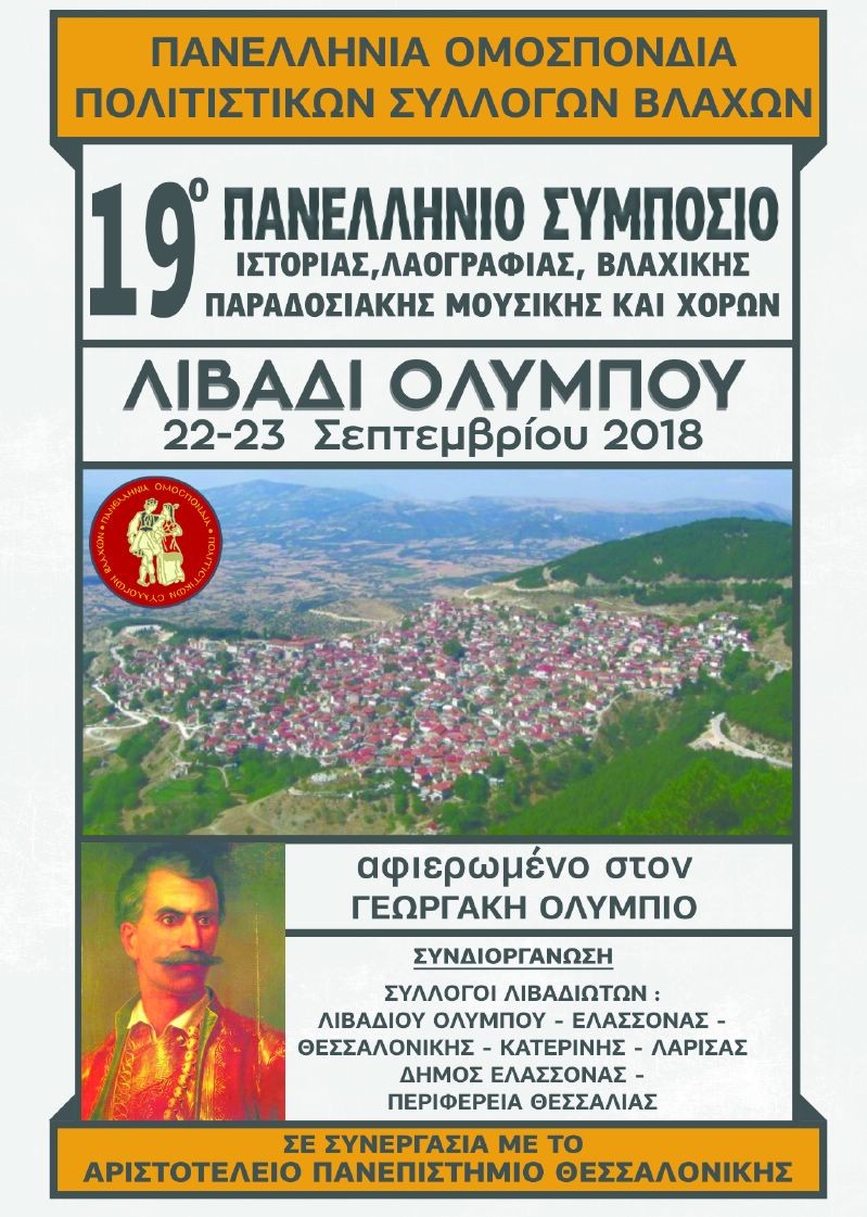 Η Πανελλήνια Ομοσπονδία Πολιτιστικών Συλλόγων Βλάχων διοργανώνει το 19ο Πανελλήνιο Συμπόσιο, αφιερωμένο στον Ήρωα Φιλικό Γεωργάκη Ολύμπιο, με θέμα: «Τα θεμέλιά μου στα βουνά και τα βουνά σηκώνουν οι λαοί στον ώμο τους» στο Ζάννειο Πνευματικό Κέντρο, στο Λιβάδι Ολύμπου ,στις 22 και 23 Σεπτεμβρίου 2018.