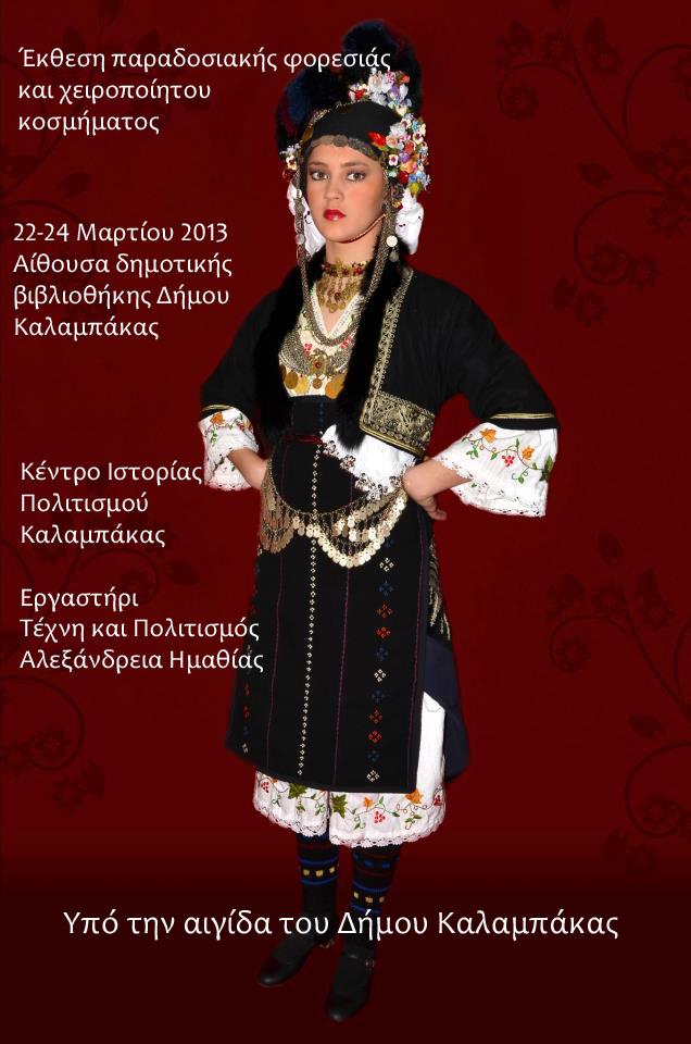 Το Κέντρο Ιστορίας και Πολιτισμού Καλαμπάκας σε συνεργασία με το εργαστήρι Τέχνη και Πολιτισμός της Αλεξάνδρειας Ημαθίας, υπό την αιγίδα του Δήμου Καλαμπάκας διοργανώνουν την 1η έκθεση παραδοσιακής φορεσιάς και χειροποίητου κοσμήματος το διήμερο 22-24 Μαρτίου 2013.