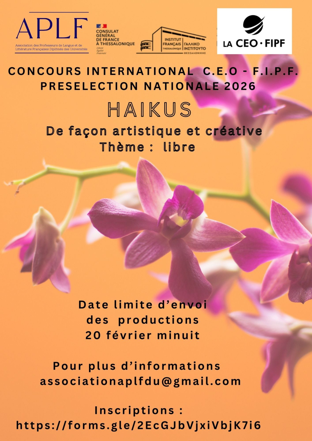 για την διάκρισή τους σε εθνικό επίπεδο στον γαλλόφωνο διαγωνισμό συγγραφής ποιήματος σε μορφή  haïku, που διοργανώνεται από την Διεθνή Ομοσπονδία Καθηγητών Γαλλικής Γλώσσας (CEO/FIPF). Το θέμα του φετινού διαγωνισμού ήταν ελεύθερο, το αποτέλεσμα όμως έπρεπε δημιουργικά και  καλλιτεχνικά να περιλαμβάνει 17 συνολικά συλλαβές που απαιτούνται σε αυτή την μορφή ιαπωνικής  ποίησης . ( https://www.aplf.gr/-n-781.html
