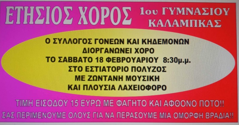 Ο Σύλλογος Γονέων και Κηδεμόνων του 1ου Γυμνασίου Καλαμπάκας διοργανώνει χορό το Σάββατο 18 Φεβρουαρίου στις 20:30 το βράδυ στο Εστιατόριο POLYZOS.