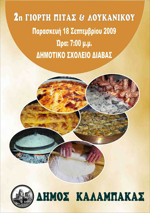 Την ερχόμενη Παρασκευή 18 Σεπτεμβρίου θα πραγματοποιηθεί στο Δ.Δ Διάβας Καλαμπάκας η 2η γιορτή πίτας και λουκάνικου. Η εκδήλωση είχε γίνει και πέρυσι γνωρίζοντας μεγάλη επιτυχία καθώς αρκετός κόσμος από την περιοχή βρέθηκε και δοκίμασε μοναδικές γεύσεις και διάφορα είδη από πίτες που έφτιαξαν οι γυναίκες της Διάβας.