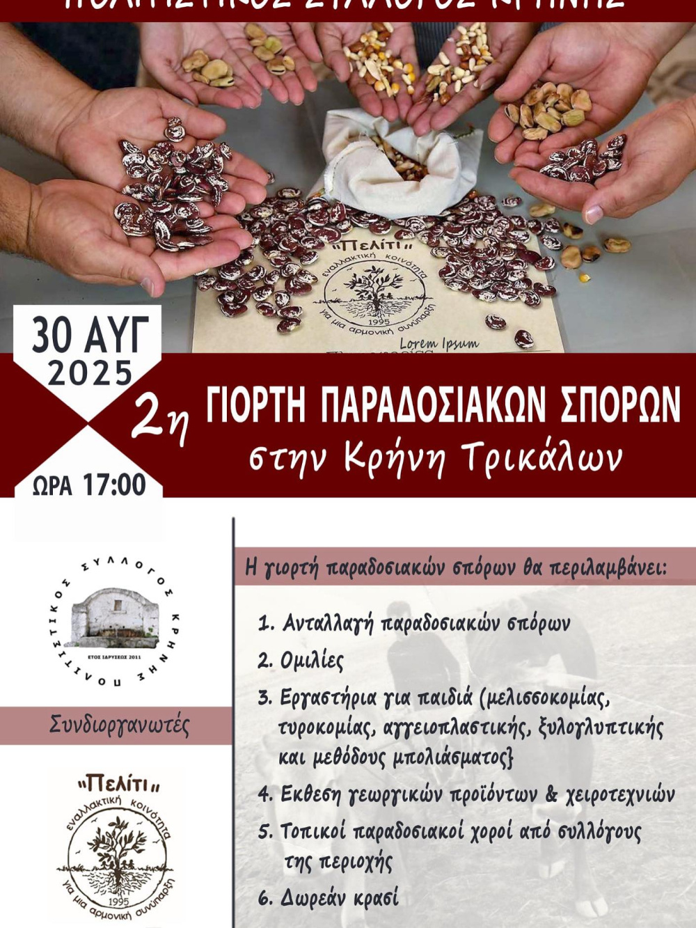 Η Κρήνη Τρικάλων ετοιμάζεται να φιλοξενήσει αύριο, Σάββατο 30 Αυγούστου στις 6:00 το απόγευμα στην κεντρική πλατεία του χωριού, μια ξεχωριστή εκδήλωση αφιερωμένη στη γη, στη φύση και στις ρίζες μας. Ο Πολιτιστικός Σύλλογος Κρήνης σε συνεργασία με την Εναλλακτική Κοινότητα Πελίτι διοργανώνουν τη 2η Γιορτή Ντόπιων Σπόρων, συνεχίζοντας έναν θεσμό που ξεκίνησε με ιδιαίτερη επιτυχία.
