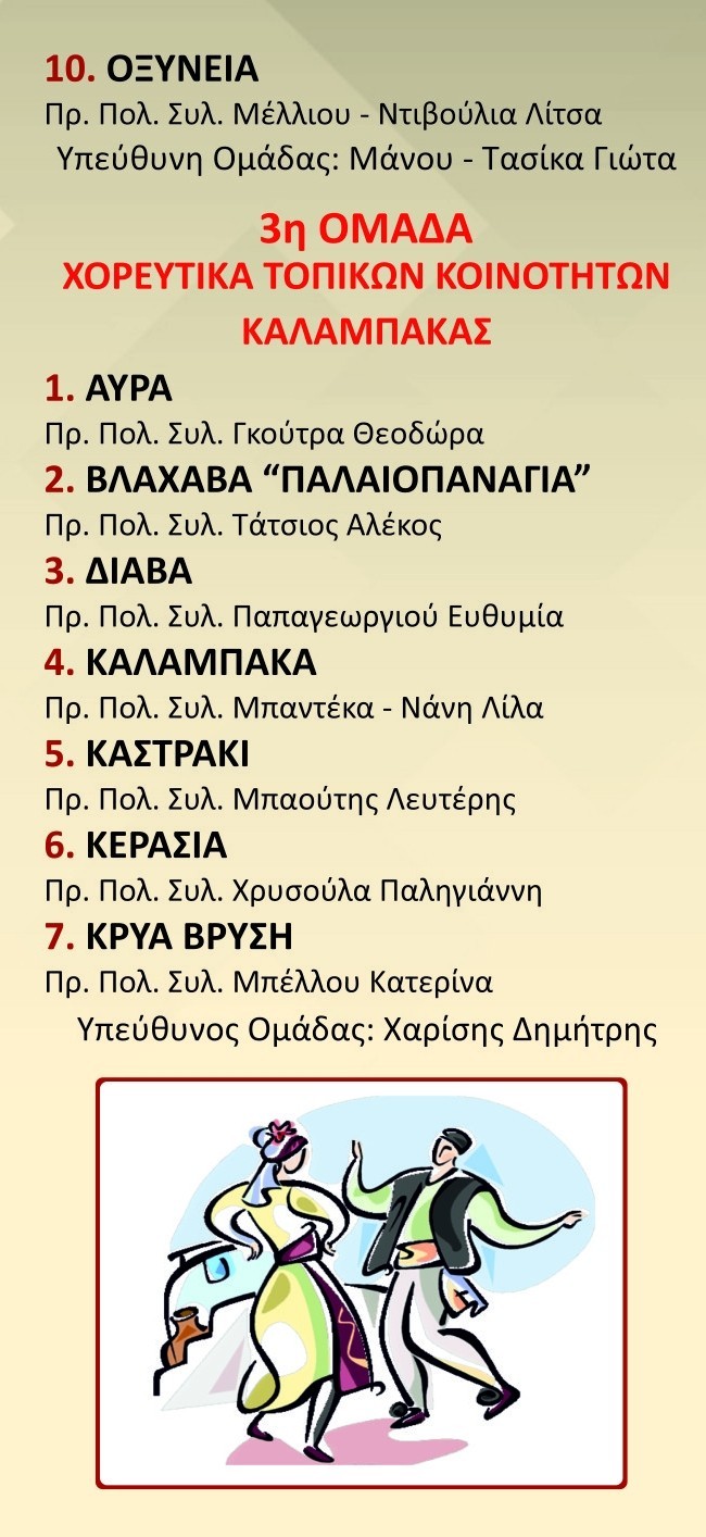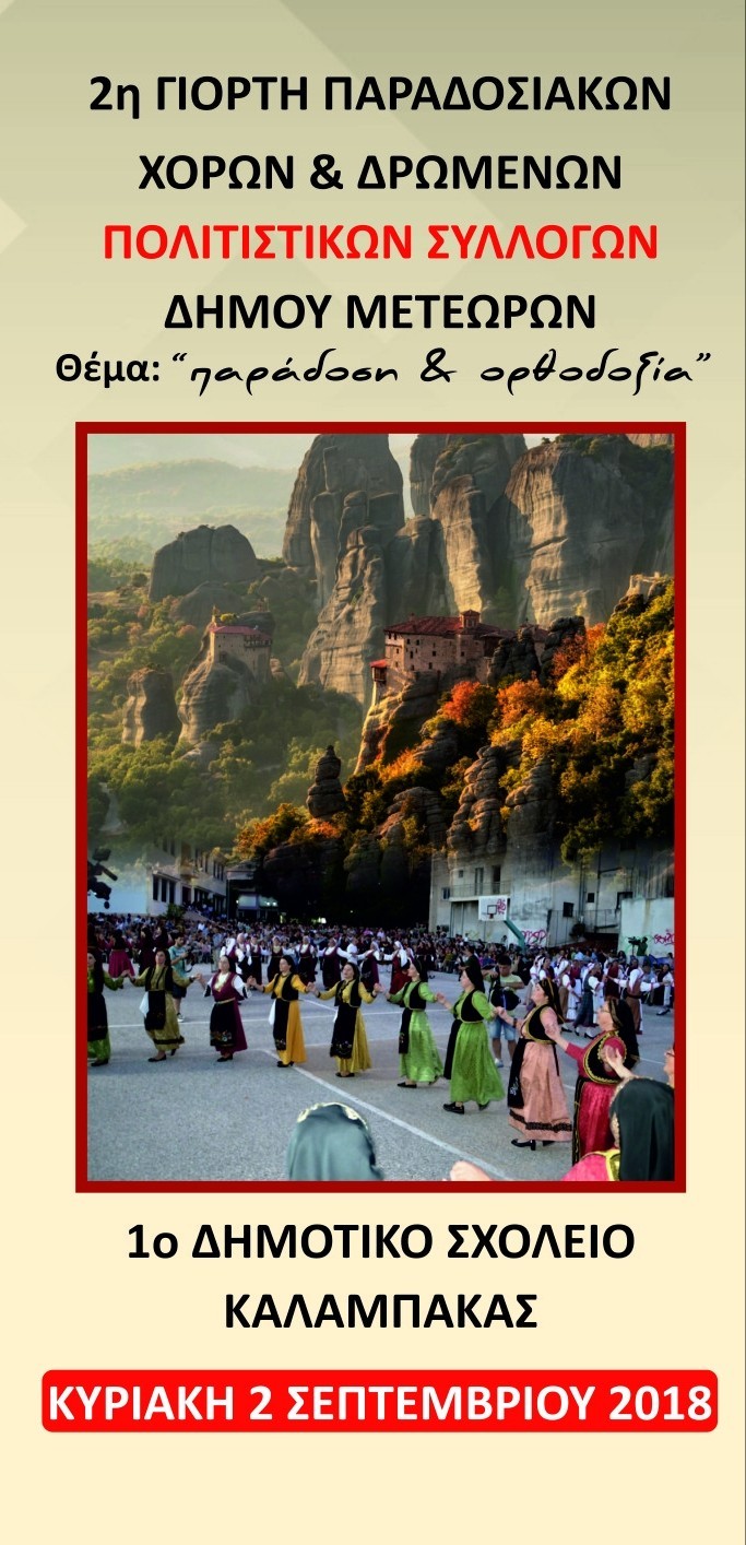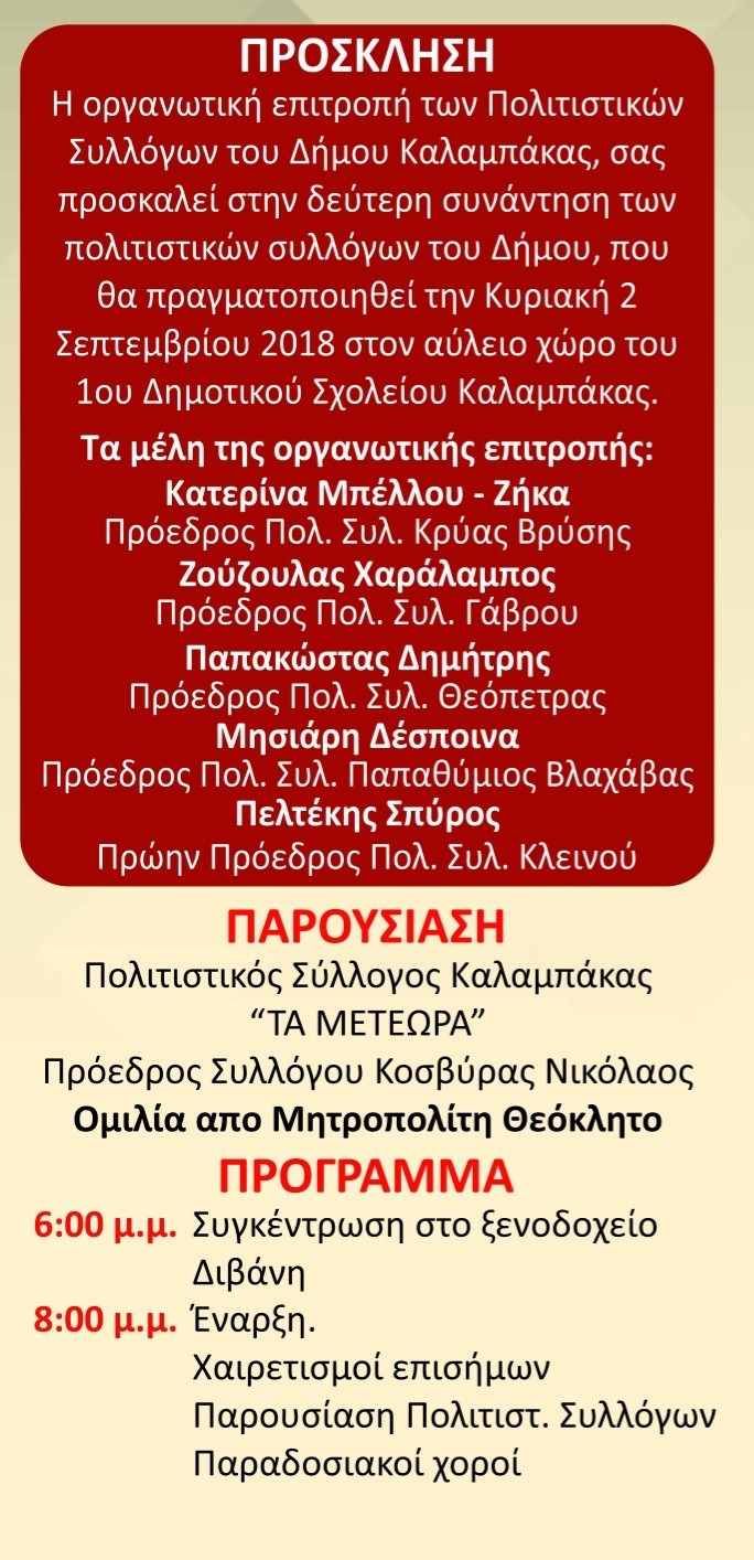 Η οργανωτική επιτροπή των Πολιτιστικών Συλλόγων του Δήμου Καλαμπάκας , σας προσκαλεί στη δεύτερη συνάντηση των πολιτιστικών συλλόγων του Δήμου ,που θα πραγματοποιηθεί την Κυριακή 2 Σεπτεμβρίου 2018 στον αύλειο χώρο του 1ου Δημοτικού Σχολείου Καλαμπάκας.