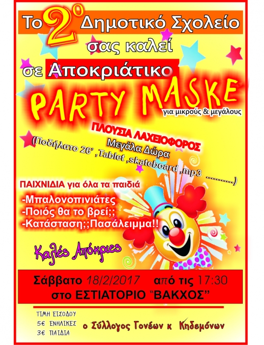 για να διασκεδάσουμε στο αποκριάτικο ξεφάντωμα που διοργανώνει ο Σύλλογος Γονέων και Κηδεμόνων του 2ου Δημοτικού σχολείου Καλαμπάκας!!