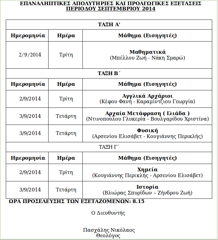 Αύριο Τρίτη το πρωί ξεκινούν οι επαναληπτικές προαγωγικές – απολυτήριες εξετάσεις περιόδου Σεπτεμβρίου 2014