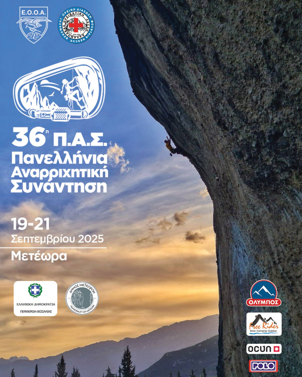 Η Ελληνική Ομοσπονδία Ορειβασίας Αναρρίχησης (ΕΟΟΑ), σε συνδιοργάνωση με την Ορειβατική Λέσχη Καλαμπάκας, ανακοινώνει με ιδιαίτερη χαρά τη διοργάνωση της 36ης Πανελλήνιας Αναρριχητικής Συνάντησης, που θα πραγματοποιηθεί στα Μετέωρα από τις 18 έως τις 21 Σεπτεμβρίου 2025, υπό την αιγίδα του Δήμου Μετεώρων, της Π.Ε. Τρικάλων και της Περιφέρειας Θεσσαλίας.