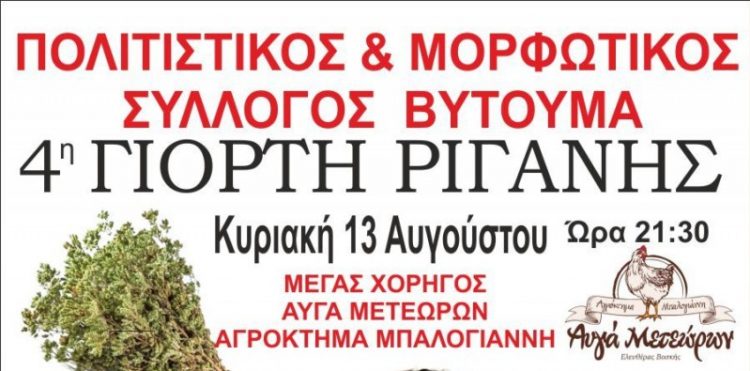 Την Κυριακή 13 Αυγούστου θα πραγματοποιηθεί η 4η Γιορτή Ρίγανης στον Βυτουμά Καλαμπάκας. Η εκδήλωση θα πραγματοποιηθεί από τον Πολιτιστικό Μορφωτικό Σύλλογο Βυτουμά στο Γήπεδο του Βυτουμά.